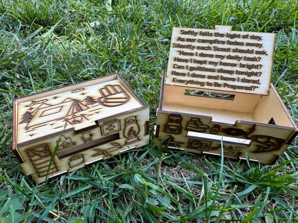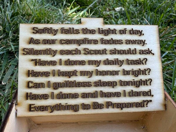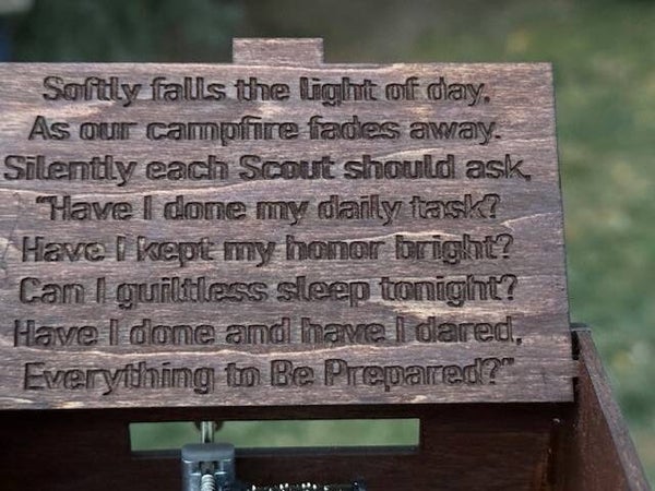 Scouting themed music box. Plays Vespers with verse on inside of lid